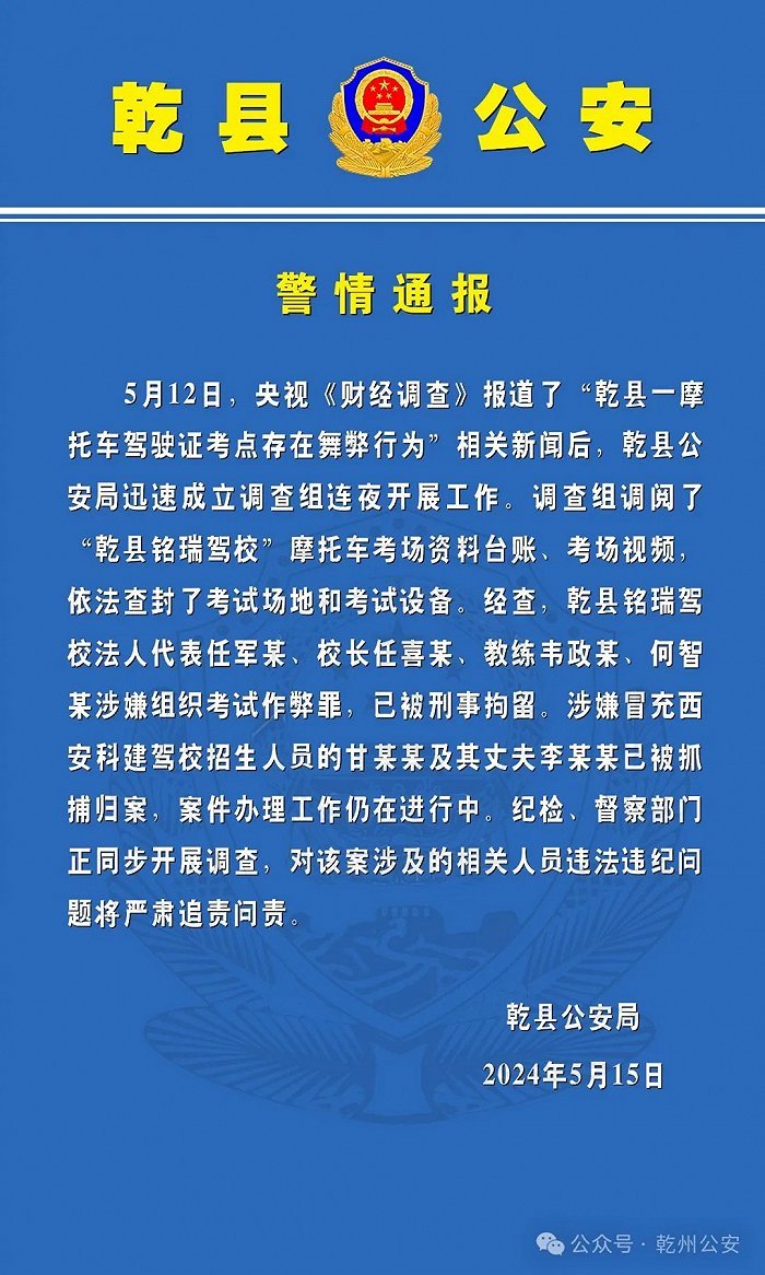 5月15日,陕西咸阳乾县公安局通报:乾县铭瑞驾校法人代表任军某、校长任喜某、教练韦政某、何智某涉嫌组织考试作弊罪,已被刑事拘留。涉嫌冒充西安科建驾校招生人员的甘某某及其丈夫李某某已被抓捕归案,案件办理工作仍在进行中。纪检、督察部门正同步开展调查,对该案涉及的相关人员违法违纪问题将严肃追责问责。