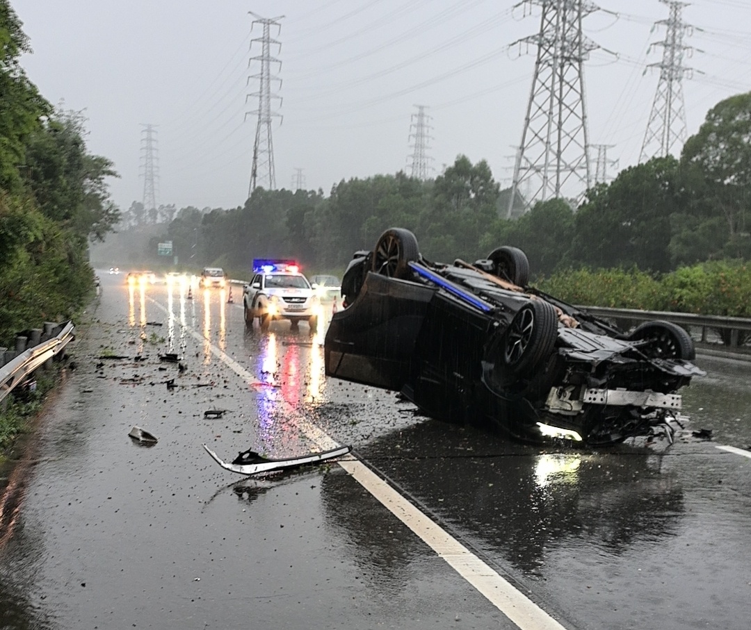 8月20日17时许,惠州市公安局交警支队高三大队接到报警称,甬莞高速往惠东方向K1409,一辆小车失控撞到护栏仰翻,车辆损坏严重,没有人员受伤,需要出警处置。